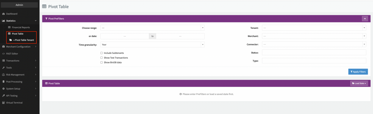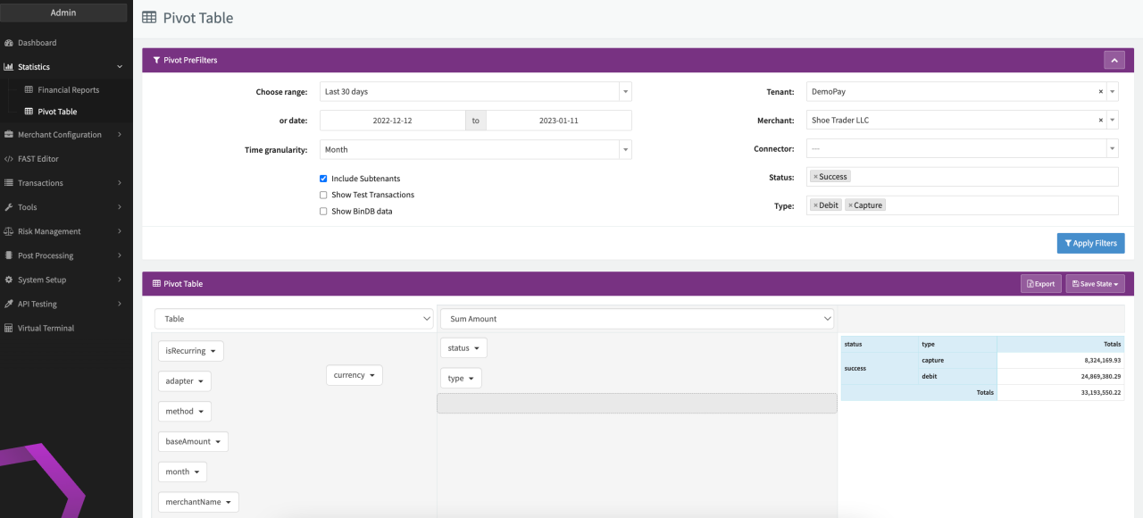 - Pivot Table Filter: Click on a variable to apply a filter to restrict the data displayed in the table. For example, you can choose which merchants to display or filter by transaction status. The variable name is displayed in italics and with a red text to indicate that a filter has been defined.