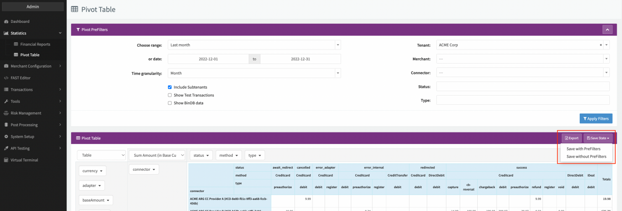- Pivot Table Data: Select which data should be grouped in the pivot table: Count Transactions, Sum Amount, Sum Amount (in Base Currency), Fees, Payout, Success Rate, Success Rate + Count, Success Rate by Volume (see Pivot Table Customization - section C)