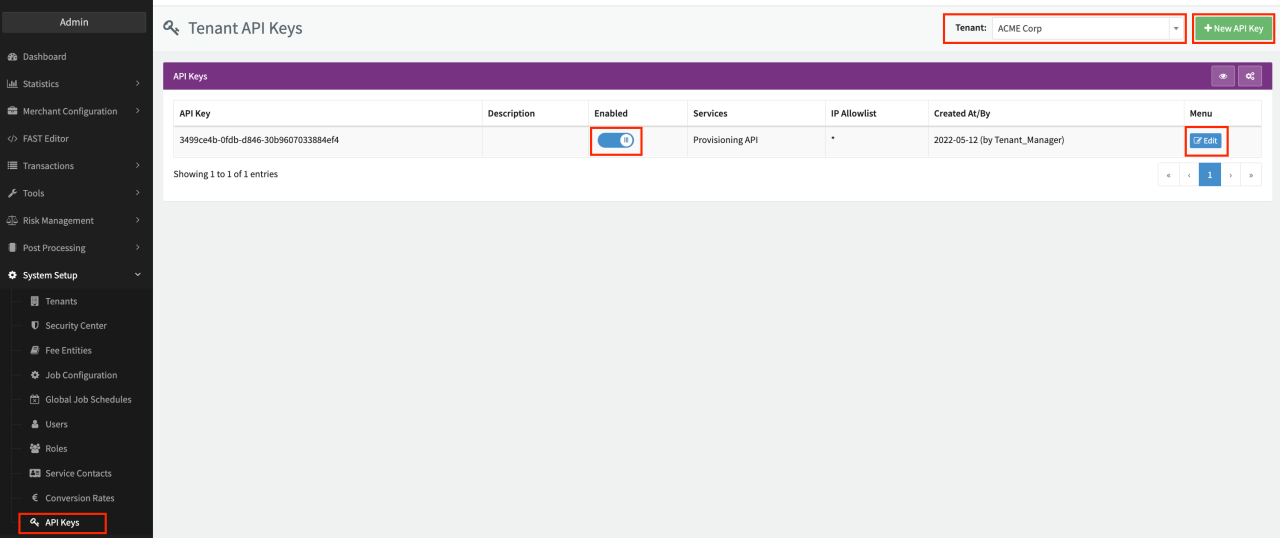 The username is the API Key, the password is the API Key's password. In this section you can create and edit API Keys for the Tenant / Sub-Tenant as follows: