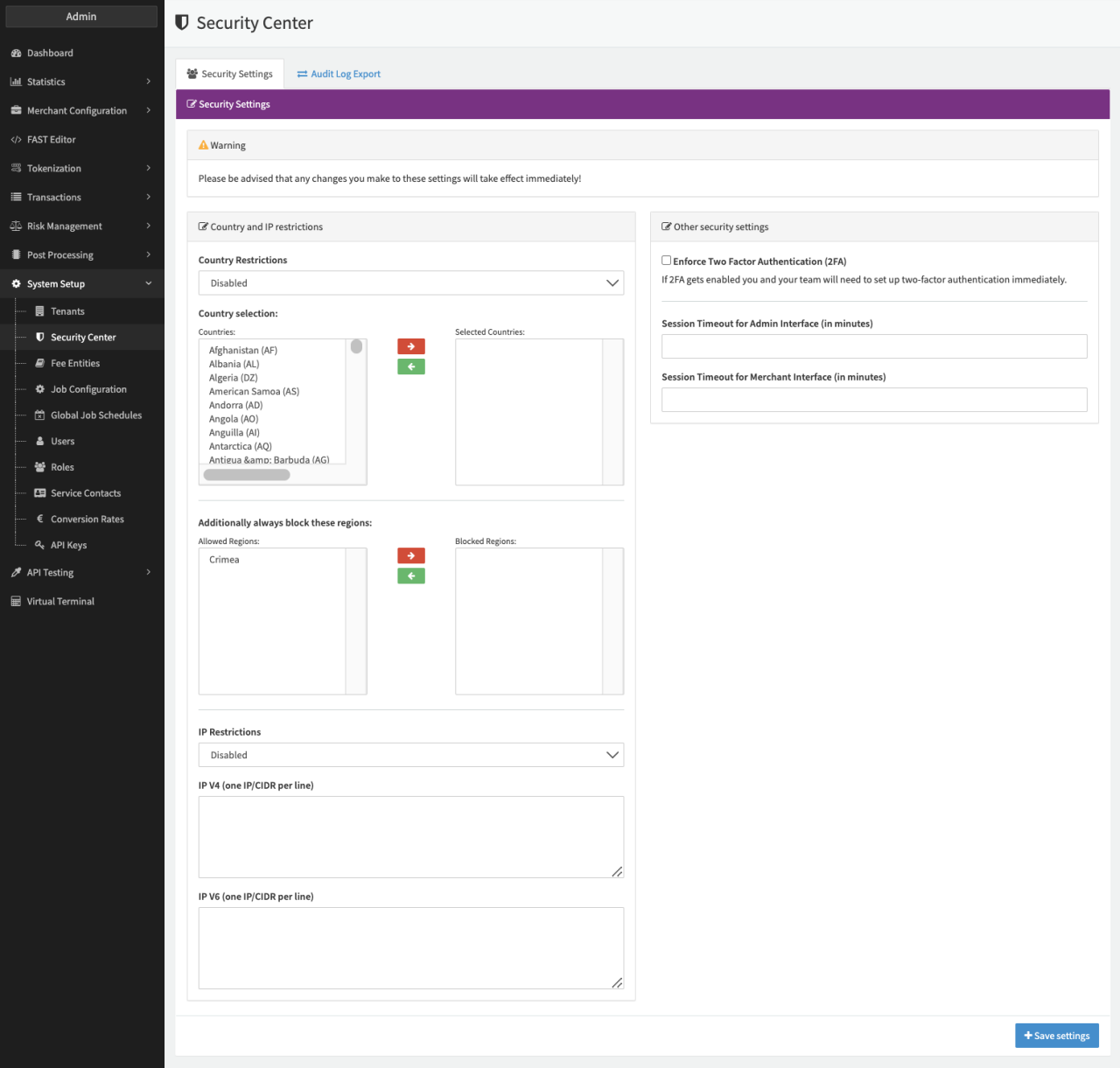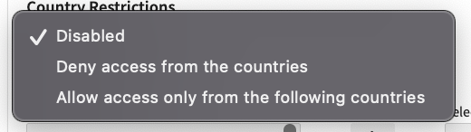 Use the Country Restrictions option to either allow or deny access to your IXOPAY platform tenant from specific countries.