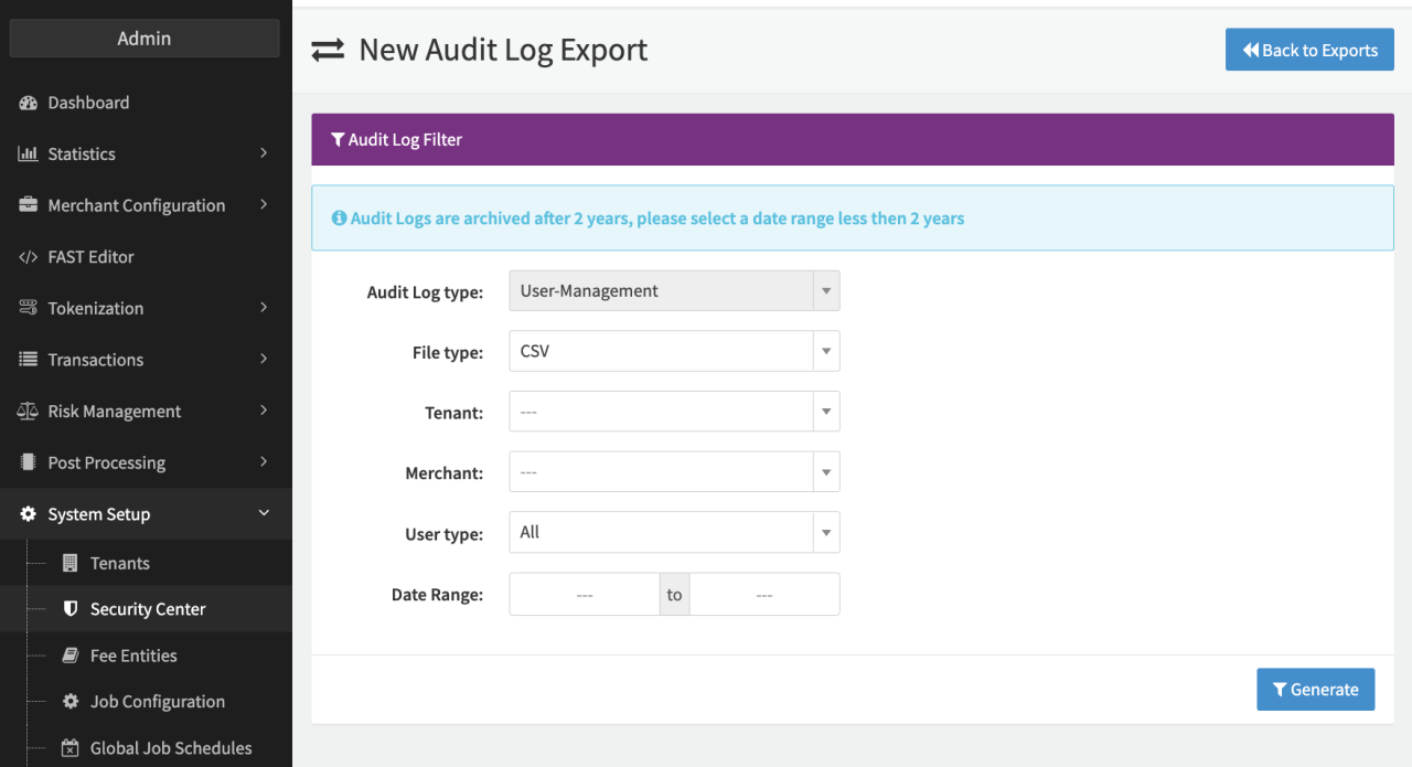 - Date Rang: Select the date range to export. Audit logs are archived after 2 years; the range should not be further than 2 years in the past.