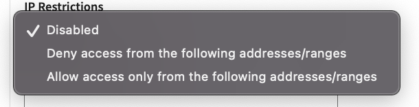 Depending on the selected IP Restrictions option, you can either allow or deny access to your IXOPAY platform tenant from specific IP ranges for IP V4 and IP V6.