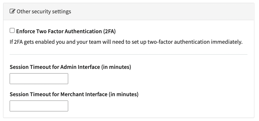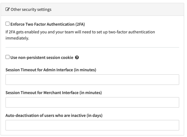 You can also set session timeouts (in minutes) for Admin (Session Timeout for Admin Interface (in minutes)) and Merchant (Session Timeout for Merchant Interface (in minutes)) interface users.