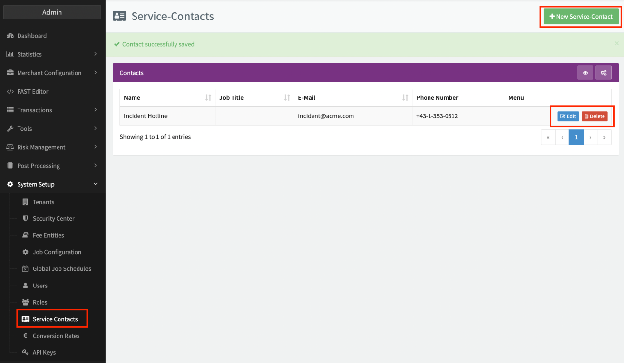 In this section you can create new Service Contacts, edit and delete existing Service Contacts.