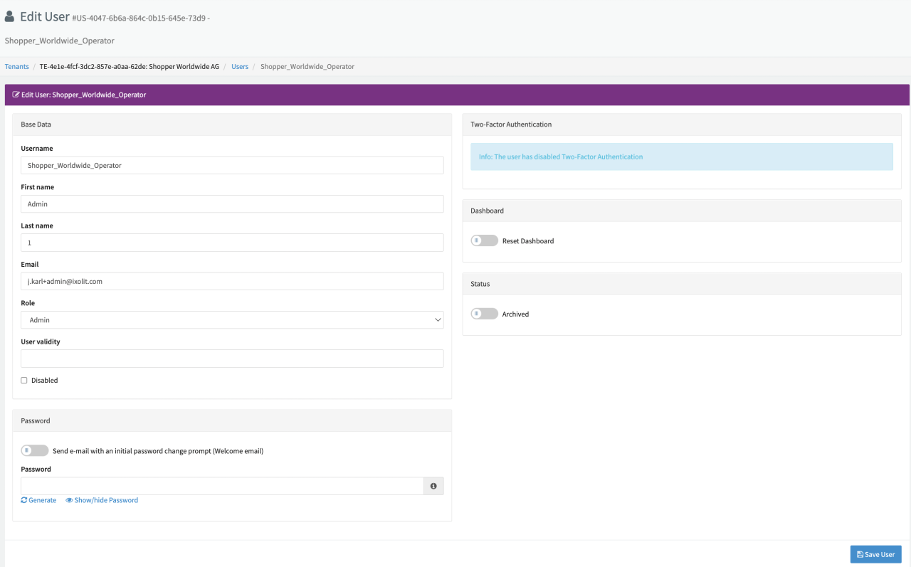 After creation the new user will shows up in the Tenant User Overview for further editing among all other tenant users including their Status and Role. This view can be filtered (including Sub-Tenant Users) and you also can directly disable users. Further select Edit to;