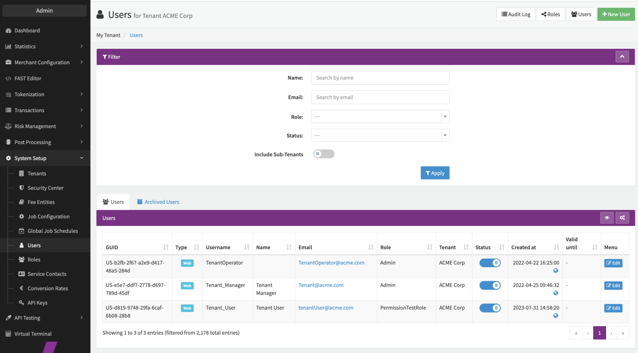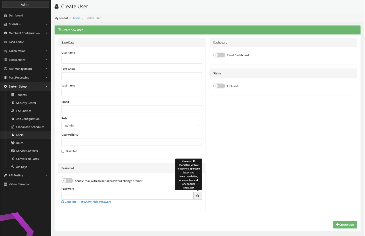 Create and edit Users who shall have access to your Payment management platform (Tenant level):