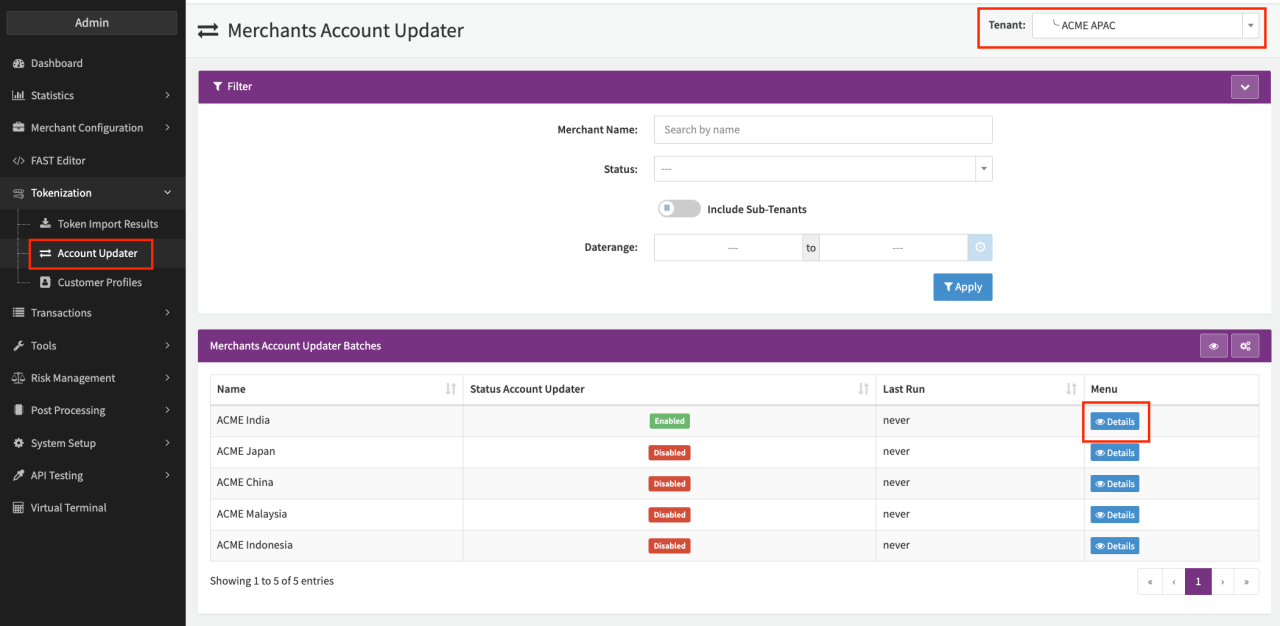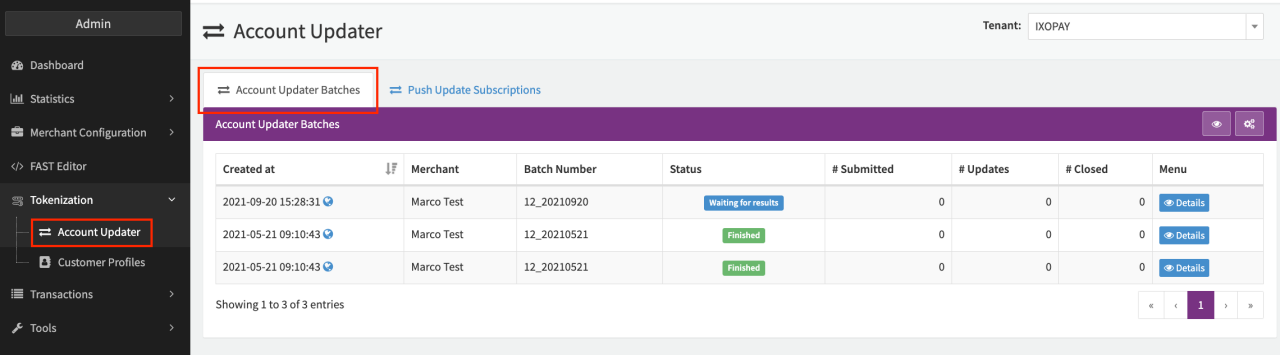 For an overview of all enrolled Merchants for the IXOPAY Account Updater, navigate to the section Tokenization sub-section Account Updater (see Overview enrolled Merchants). You can either use the Tenant Filter or Filter to narrow down your search. Select Details to find the Account Update List.
