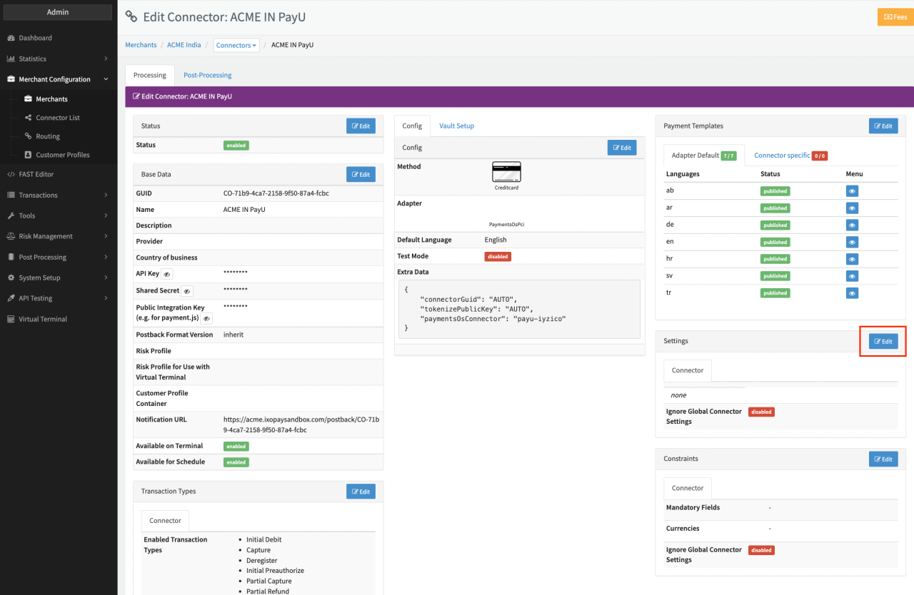 - Go to the Connectors Overview on the configured merchant and click Edit
