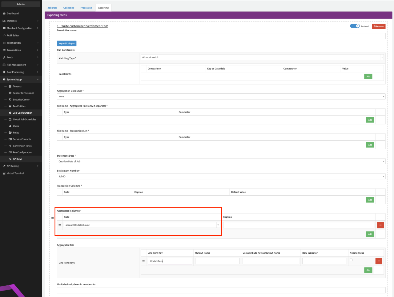 - the Exporting Step Write customized Settlement CSV, configured with the Aggregated Columns — accountUpdaterCount and Line Item from 3.a.