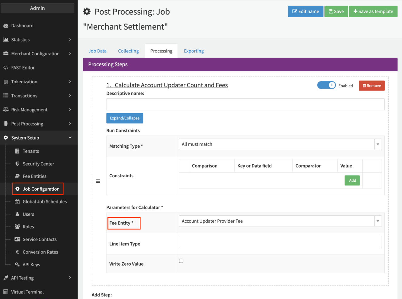 - the Processing Step Calculate Account Updater Count and Fees, configured with the created Fee Entity from 1. and including the Line Item Type