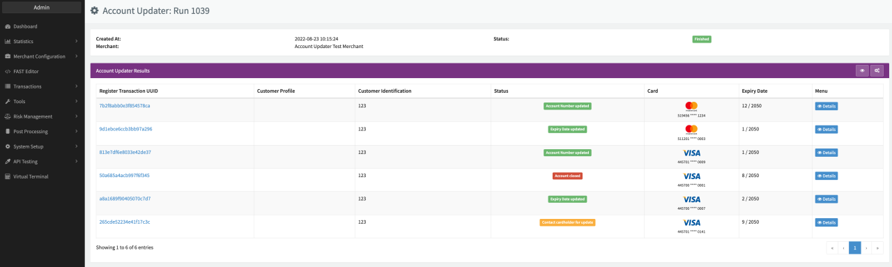 Furthermore you can get detailed information about received updates in the section Tokenization > Account Updater (see Account Update Lists). Select Details for the enrolled Merchant to see the list of updates (see Overview enrolled Merchants).