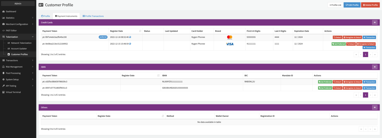 - Detach — to detach the payment instrument from the Customer Profile (payment instrument will still be stored — additional costs may apply).