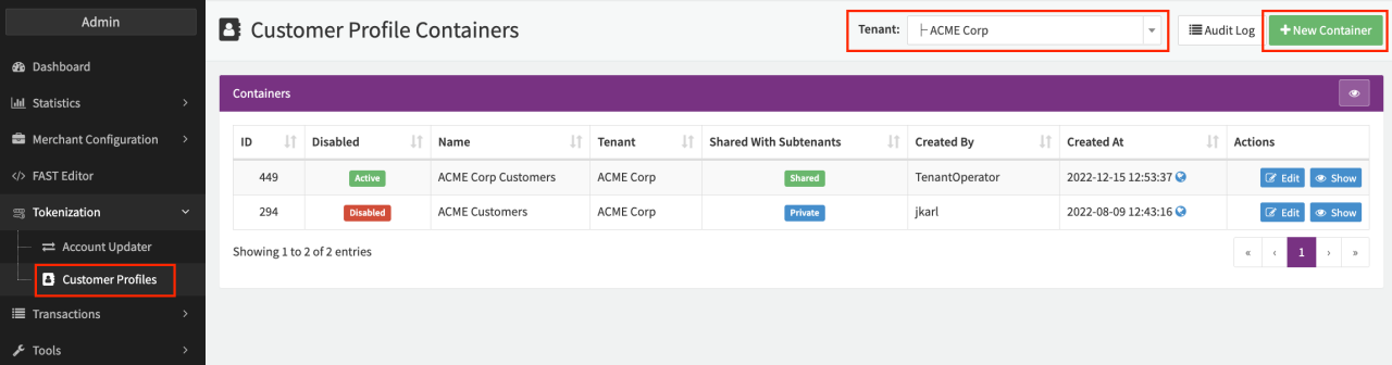 The Container will appear in the Customer Profile Container Overview and can be edited at any time by clicking edit. You can also access the Customer Profiles stored in the Container by clicking show (see Customer Profiles).