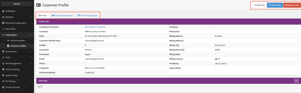 This tab contains base data about the Profile such as Customer data (e.g. personal data, billing data), the Connector used to create the Customer Profile, Customer Profile GUID, and Customer Identification, as well as the Preferred method (see also Payment Instruments). The section Extra Data can be used to store any additional data.