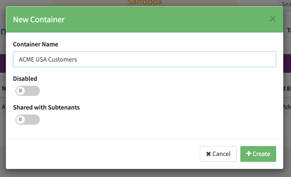 - Enable the option Shared with Subtenants if you want to share Customer Profiles among different Sub-Tenants (see New Container).