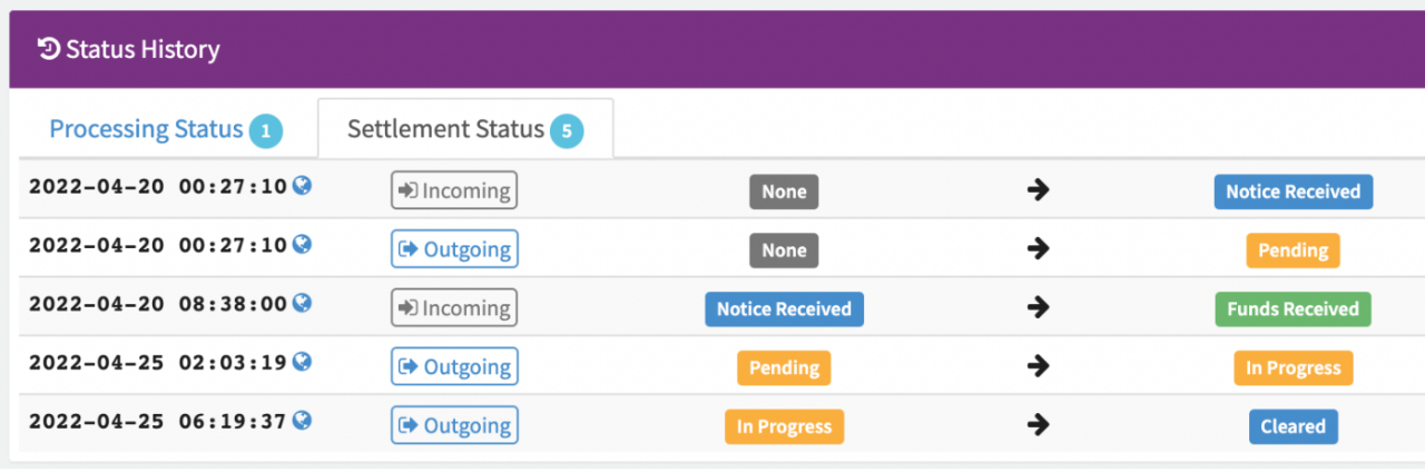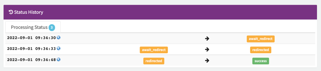 In this section you will find the different Processing Status Changes (e.g. await_redirect to redirected, redirected to success) as well as Settlement Status Changes (e.g. Notice Received, Funds Received, Pending, In Progress, Cleared) incl. timestamp.
