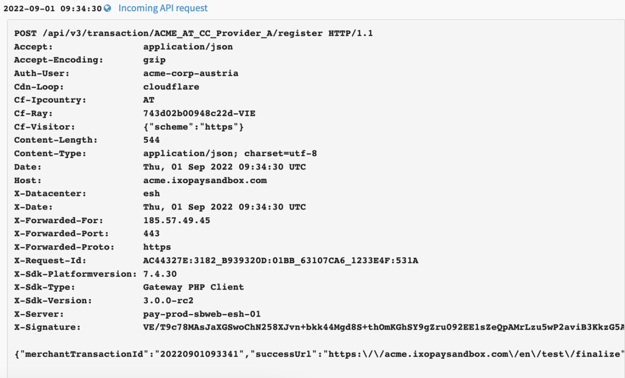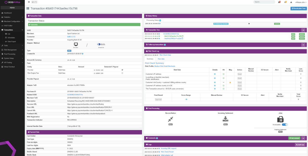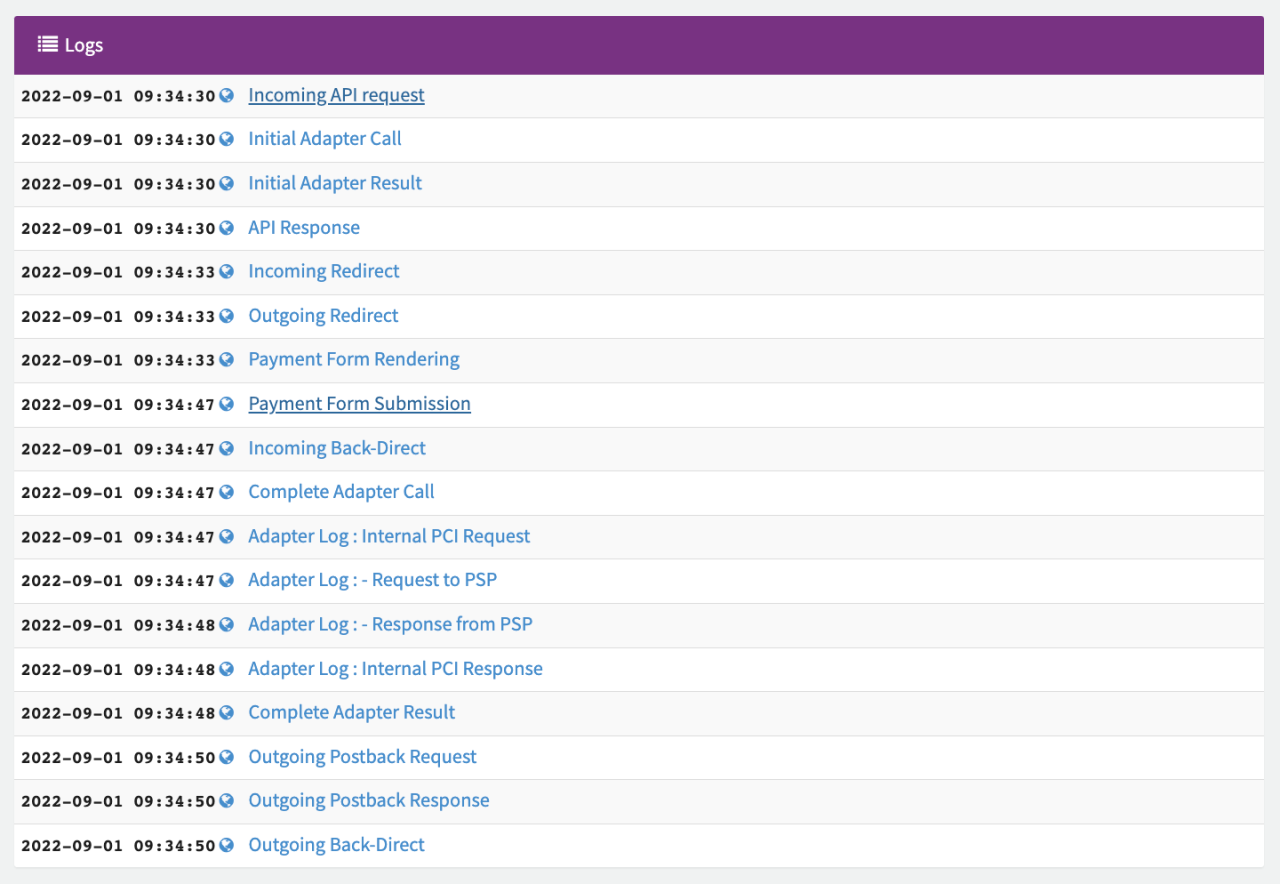 In this section you will find all data relating to the transaction processing starting from the moment the API Request is received by the IXOPAY platform, including all intermediate (Payment Form Rendering, Redirecting, Postback Notifications) and executed actions with different PSPs in the background (Adapter Calls) with exact timestamp (UTC).