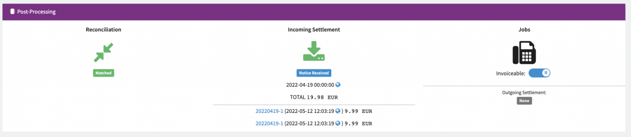 - Jobs: Are there any Post-Processing Jobs where this Transaction was considered for or Outgoing Settlements. Additionally you can set/remove the invoice-able flag, which may be relevant for particular job steps.
