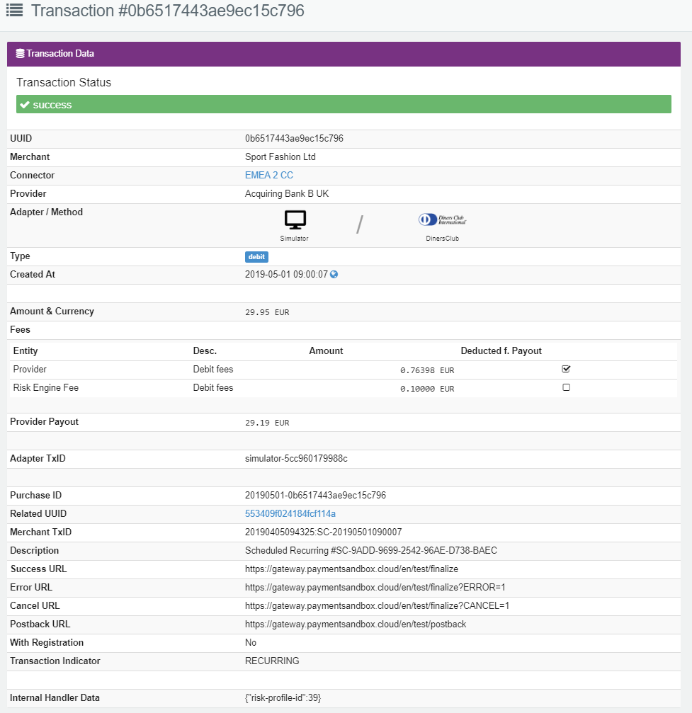 In this section, similar to the Transaction Status, you will find data and links to related transactions (e.g. pre-authorize and capture transactions, splits, refunds, chargebacks) and followup transactions (e.g. scheduled transactions) to the current transaction