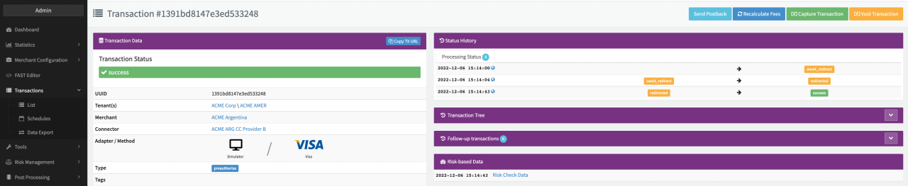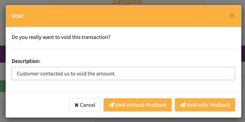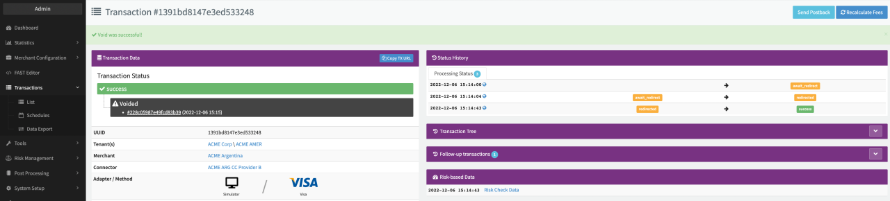 Depending on the given Permissions and prerequisites, Users can void transactions manually (e.g. in case a customer get directly in contact with customer support). This can be done by using the Void Action Buttons in the Transaction Details.