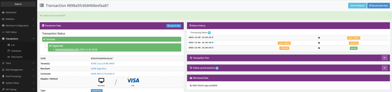 During Confirmation, the User can then change the Amount to perform partial captures. Once confirmed the Capture Transaction will be created and shown in the Transaction Status of the original Preauthorize Transaction.